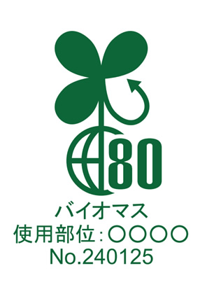 またバイオマスマークを取得しており、生物由来の物質の割合を示すバイオマス度は「80」となっております。